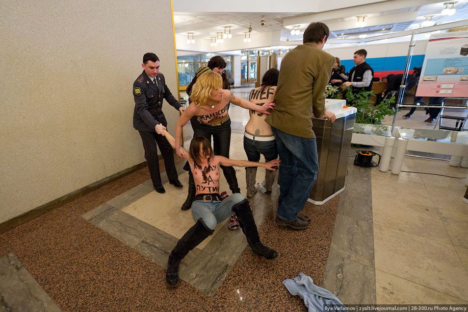 Девушки выступали традиционно топлесс, на их телах были надписи «Краду за Путина», а сами они скандировали: «Путин — вор!». Феминистки задержаны полицией. К избирательному участку стягивается ОМОН.