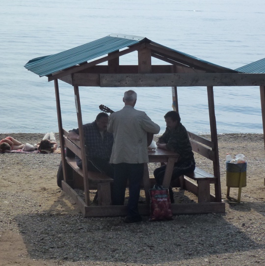 Местный "бард" побирается, развлекая подвыпивших отдыхающих попурри из шансона.