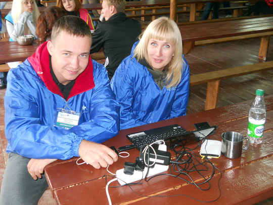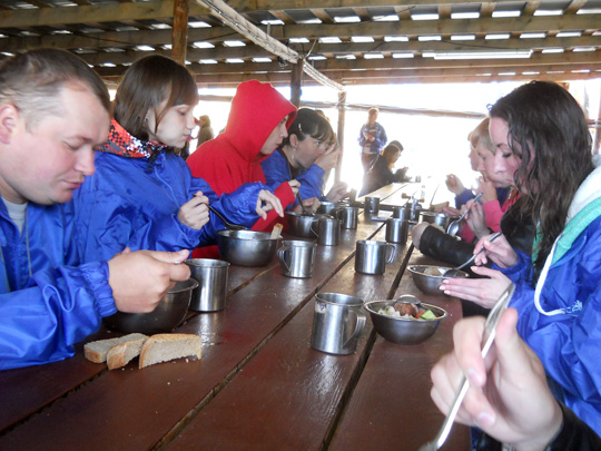 Кроме курилки местом массового скопления народа была ещё и столовая. В первые сутки работы лагеря она функционировала в авральных условиях: столовую одновременно штурмовали по несколько сотен человек. Но скоро организаторы подключили, наконец, громкоговорители, которые и стали направлять дальнейшие действия участников форума. Теперь на завтраки-обеды-ужины мы ходили организованными группами – по пять стоянок за раз. Это не больше сотни человек.