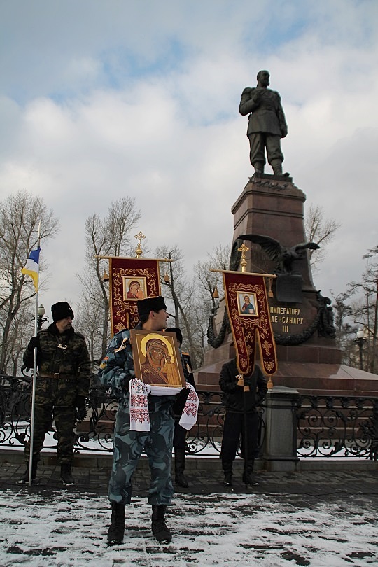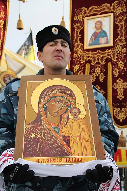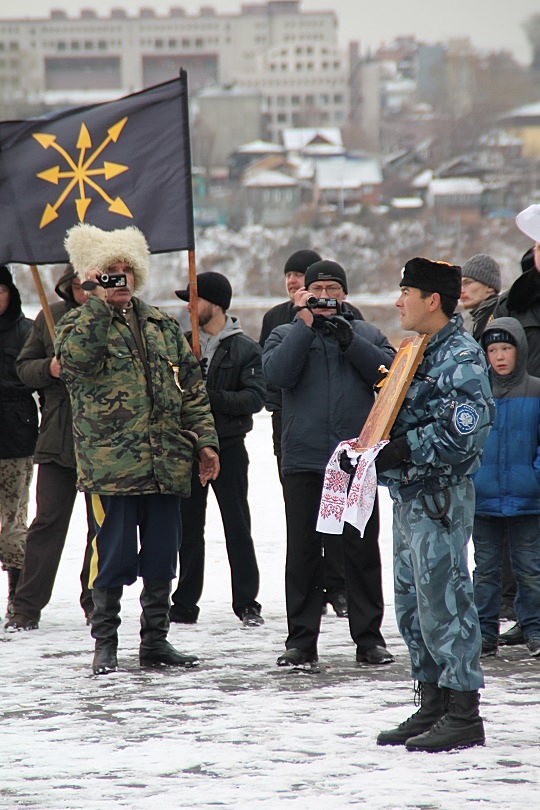 Всю дорогу иркутские националисты выкрикивали лозунги, несли флаги, плакаты и несколько икон.