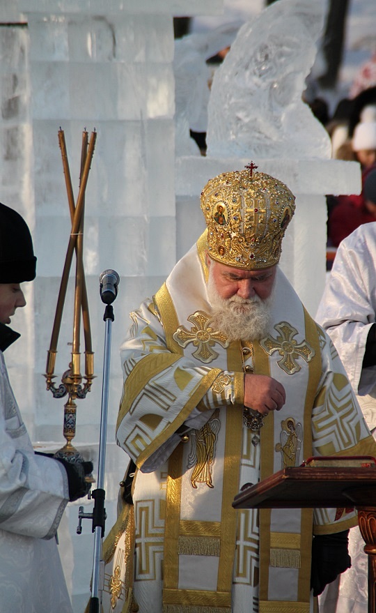 Церемония освящения воды в проруби началась утром, ее провел митрополит Иркутский и Ангарский Вадим.