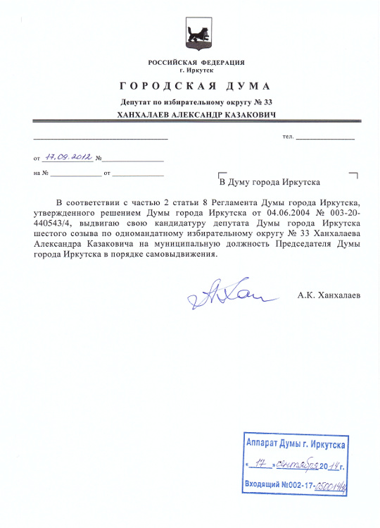 В понедельник 22 сентября сразу пять заявлений были зарегистрированы аппаратом Думы города Иркутска.