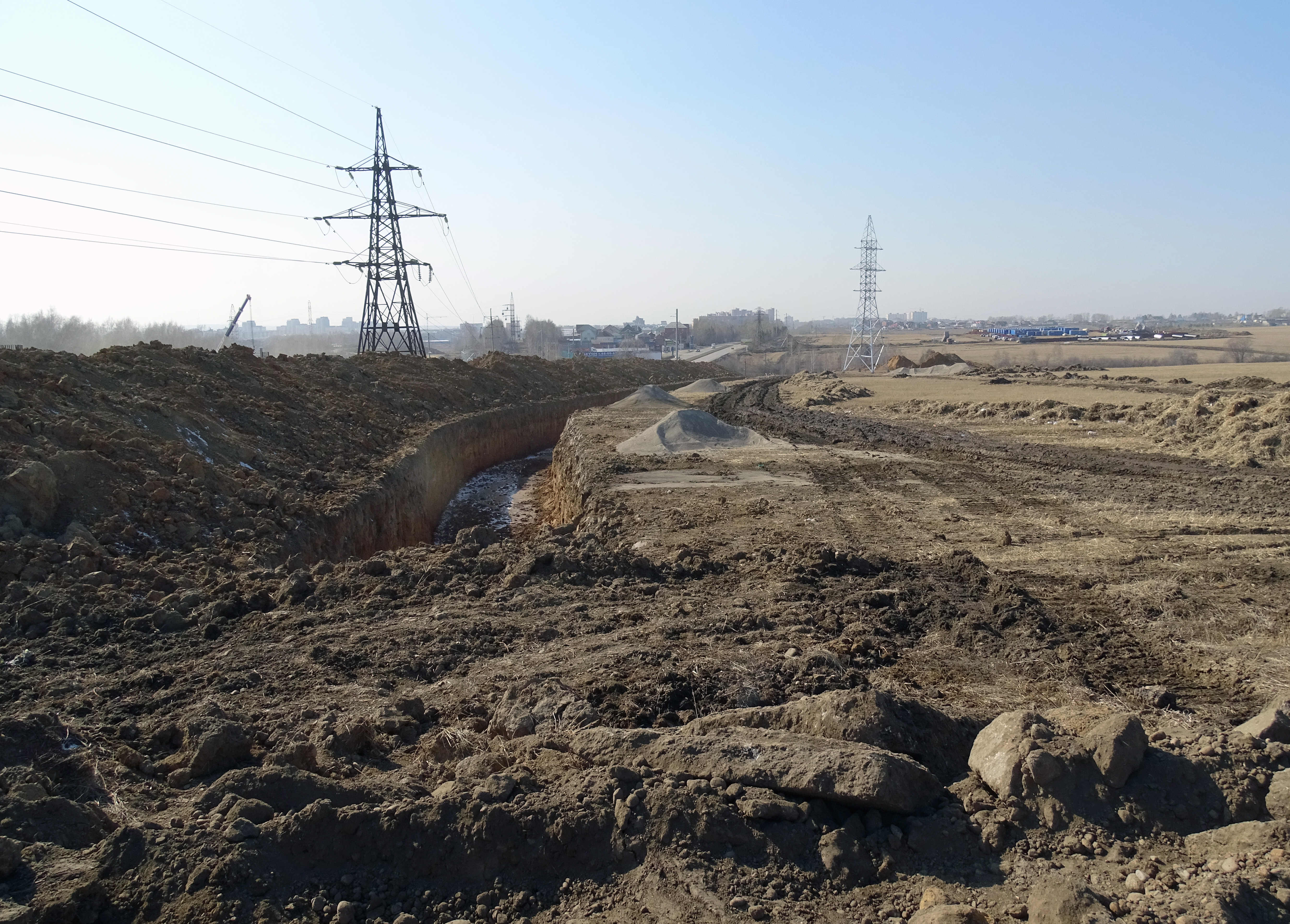 Вдоль будущей дороги тянут глубокие свежие траншеи. Видимо, для теплосетей и канализации.