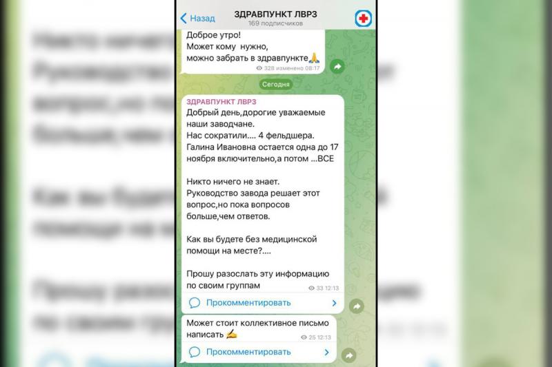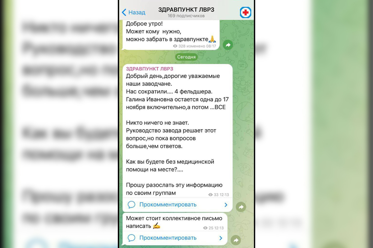 На ЛВРЗ обострилась проблема с медицинской помощью для работников. По данным источника, штатный медпункт фактически ликвидирован, а вместо него на предприятие направили сотрудников ЧУЗ «РЖД-Медицина». Завод дал официальный ответ, якобы «всё остаётся как было, фельдшера переходят в поликлинику». Но работники сразу опровергли эту информацию.