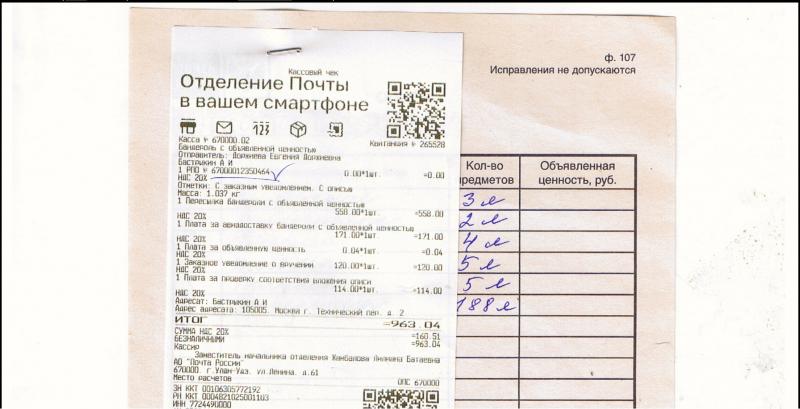 Квитанция Почты России о направлении бандероли весом один килограмм на имя Александра Бастрыкина