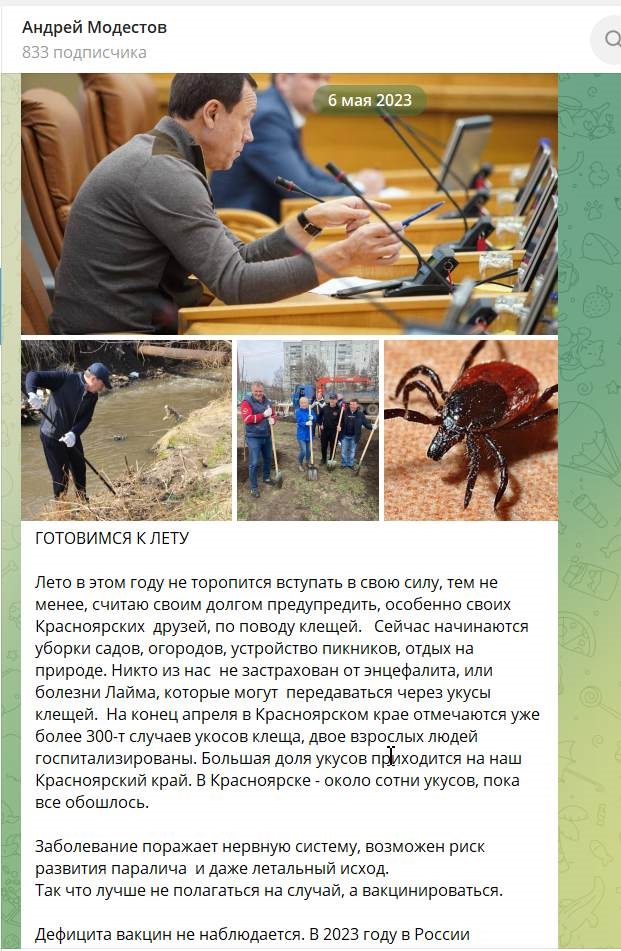 Примечательно, что в канале министра здравоохранения Иркутской области Андрея Модестова призыв вакцинироваться удалось найти только за 2023-й год, когда он из Москвы предостерегал своих красноярских друзей (хоть и тоже поздно для сезона). Иркутскую область что-то не призвал прививаться от энцефалита ни разу за два года...