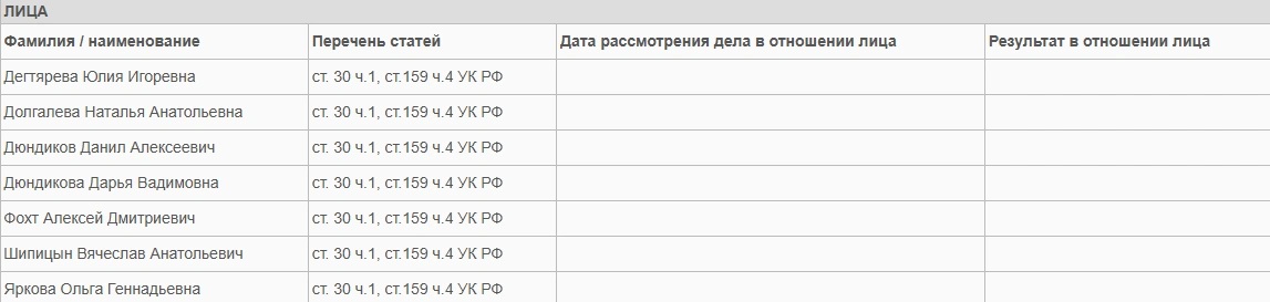 Помимо самого Шипицына, который продолжает находиться в СИЗО, на скамье окажутся ещё шесть человек. Среди них — начальник отдела потребительского рынка районной администрации Юлия Дегтярева, секретарь Шипицына Наталья Долгалева, бывшая начальница районного отдела УФМС Ольга Яркова, а также трое местных жителей: Алексей Фохт и супруги Данил и Дарья Дюндиковы. Состав участников напоминает сценарий криминального сериала: здесь и чиновники, и бывшая сотрудница правоохранительных органов, и рядовые граждане, позарившиеся на лёгкие деньги.