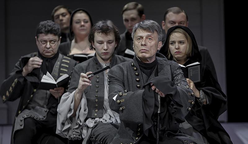 Арнольф в спектакле «Школа жён». Театр Маяковского, постановка 2021 года