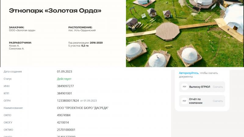 Ранее Бабр подробно разобрал структуру этой фирмы. Напомним, ООО «Проектное Бюро "Дасреда"» (ОГРН 1233800017824) зарегистрировано в сентябре 2023 года. В презентациях компания заявляет о девяти годах опыта и 100 реализованных проектах: этнопарк «Золотая Орда», парк «Северное сияние Байкала» и другие. Юридически эти проекты принадлежат старому юрлицу с похожим названием, но которое сейчас финансово несостоятельно.