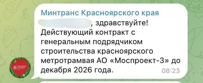 17 февраля Минтранспорта края ответило тому же красноярцу, что контракт с генеральным подрядчиком «Моспроект-3» истекает в декабре 2026 года.