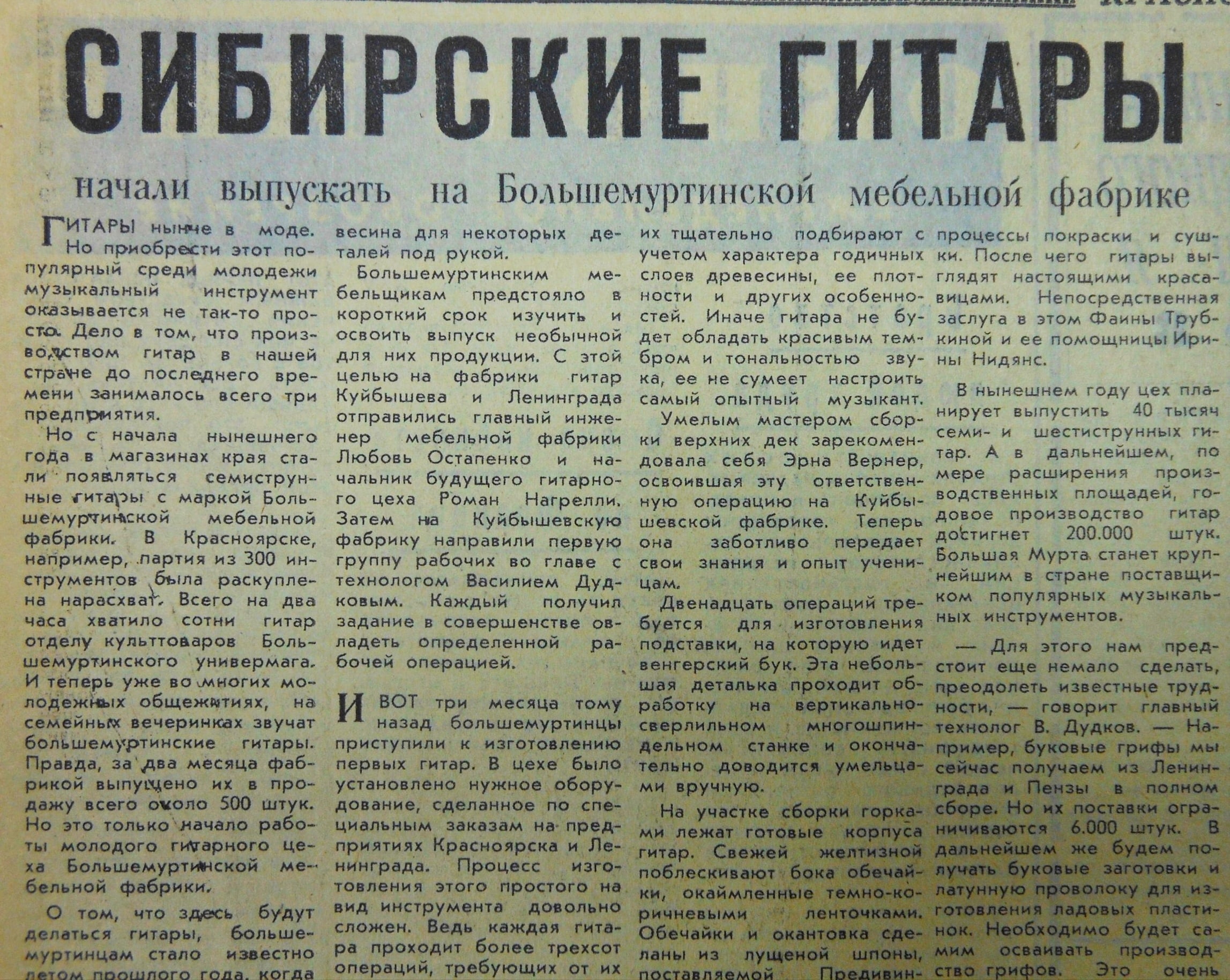 Большемуртинская мебельная фабрика стала четвёртым предприятием в стране, которое выпускало этот инструмент. А со временем и вовсе стала одним из крупнейших поставщиков гитар в СССР. Большемуртинские гитары можно было встретить в магазинах по всей стране.
