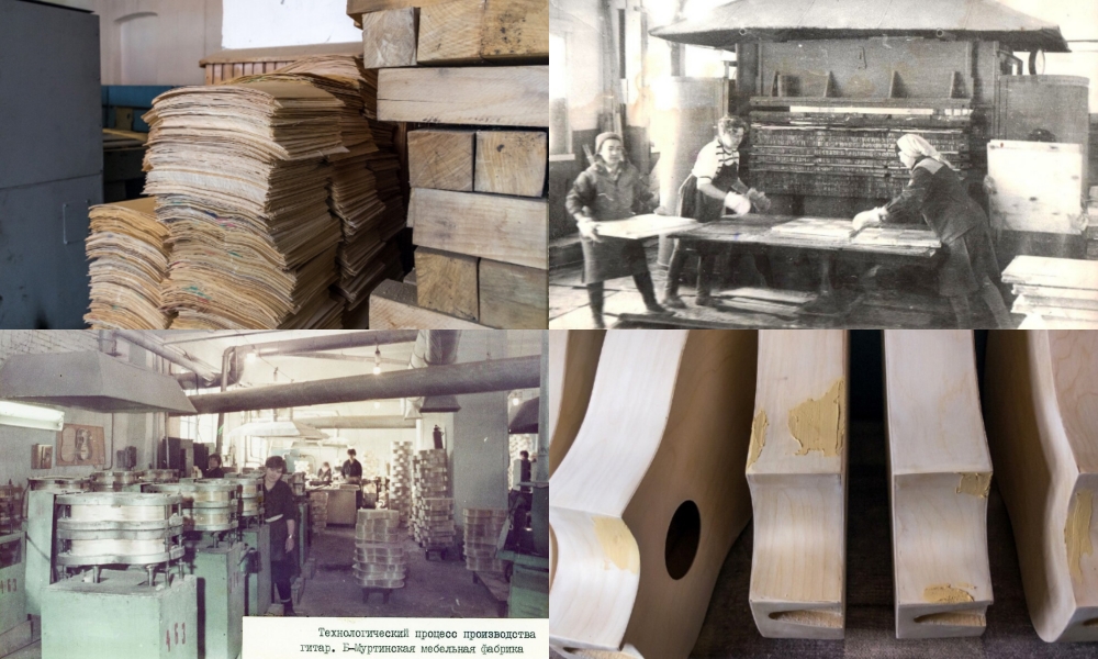 Сначала кроили верхнюю и нижнюю деки. Затем прессовали шпон в блок для последующего изготовления гитарного грифа. Потом блок разрезали на четыре части, собирали и шлифовали. В корпусном цехе делали боковую изогнутую часть гитары – обечайку. На прессах по несколько штук склеивали готовые корпуса, а на фрезерном станке вытачивали паз под гриф. После шпаклевали изъяны и стыки, сушили и шлифовали изделие.