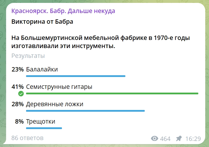 Посёлок Большая Мурта расположен в ста километрах от Красноярска. Именно там в конце 1970-х годов изготавливали популярный на тот момент музыкальный инструмент – семиструнные гитары. По этой теме Бабр в прошлые выходные проводил викторину в своём телеграм-канале Красноярск. Бабр. Дальше некуда (@kras_24). Большинство её участников знали правильный ответ.