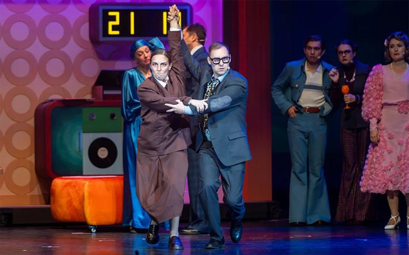 Сценография Ольги Грицаевой яркая и стильная, но больше подошла бы к фантастическому мюзиклу по сюжету каких-нибудь Стругацких, а не к производственной мелодраме эпохи соцреализма. По этой же причине карикатурно выглядят вставные элементы из 1970‑х: шнуровые телефоны, настольные калькуляторы, гранёные стаканы и наградные вымпелы. В какое время попал зритель? Да какая разница.