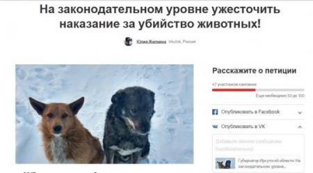 На площадке Change.org появилась петиция «На законодательном уровне ужесточить наказание за убийство животных!», созданная иркутскими зоозащитниками. Она направлена губернатору и прокуратуре Иркутской области, а также президенту РФ.