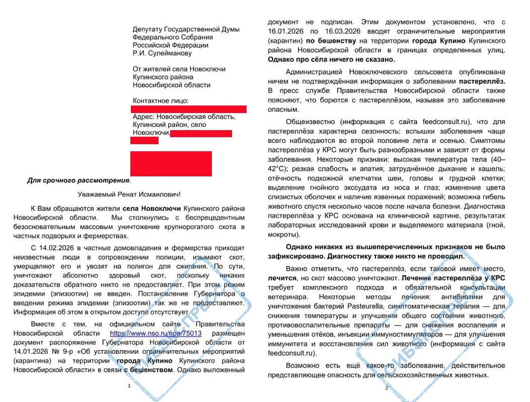 Терпение жителей лопнуло 23 марта. Инициативная группа приехала в региональную прокуратуру, чтобы подать коллективное заявление на действия губернатора Андрея Травникова. Главу региона обвиняют в подписании «преступных приказов» о массовом уничтожении скота. По мнению жителей, действия власти попадают как минимум под четыре статьи УК РФ: незаконное вторжение в жилище, причинение вреда имуществу, превышение должностных полномочий и жестокое обращение с животными. Люди требуют не просто компенсаций. Главное требование сегодня — отставка губернатора Травникова. Соответствующие заявления уже направлены президенту РФ, в Генеральную прокуратуру и Следственный комитет.
