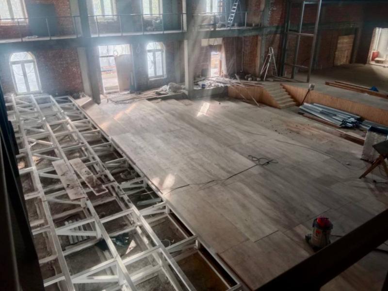 В главном зале установлены металлокаркас амфитеатра, черновой настил полов и голые стены, которые только-только готовят под покраску или обшивку. Никаких кресел и сценического оборудования. Свисающие провода, пыль столбом. Это и есть чистовая отделка помещения?