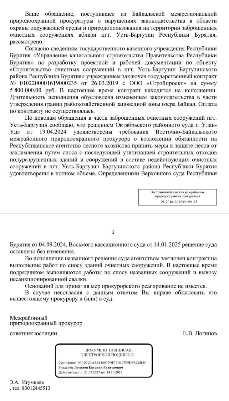 Ответ Восточно-Байкальской межрегиональной природоохранной прокуратуры на обращение общественников