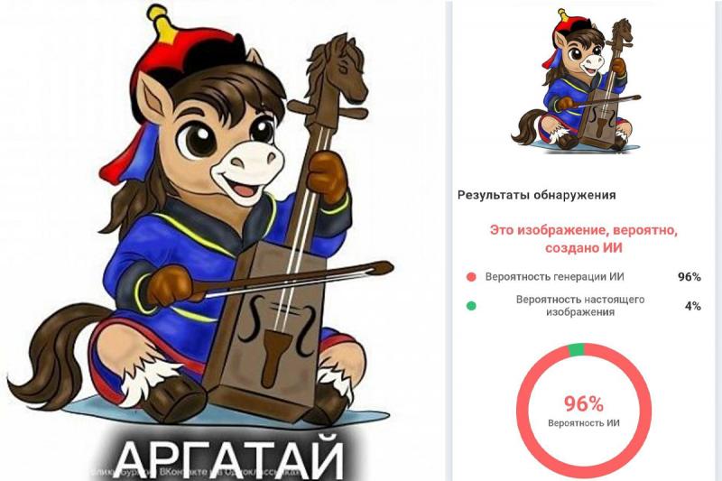 Победителем жюри признало работу Анастасии Бамбалаевой из Заиграевского района – коня по имени Аргатай, «дружелюбного, живого и многогранного героя», как его описало ведомство. Девушке достался главный приз – 50 тысяч рублей. Почти сразу после публикации итогов пользователи обратили внимание на визуальные особенности изображения и предположили, что рисунок мог быть сгенерирован нейросетью. Проверки через открытые сервисы показали высокую вероятность использования ИИ – 96 %. Не допустимо, скажете вы. Однако туз оказался в кармане министерства.