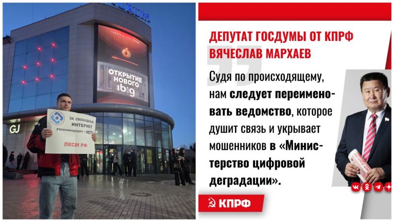 Сегодня в Улан-Удэ член Ленинского Комсомола Андрей Афанасьев вышел на одиночный пикет в защиту свободного интернета и против блокировок и замедления социальных сетей и мессенджеров. Реакция системы последовала мгновенно. К активисту подтянулся наряд, включая замначальника отдела охраны общественного порядка майора Сергея Тарасова. Андрея безосновательно доставили в Советский районный отдел МВД, где его продержали два часа. <…> Но комсомольцев не запугать. Как только Андрей вышел из отдела, он продолжил пикетирование. Показательный момент: власть боится даже плаката о свободном доступе к информации.