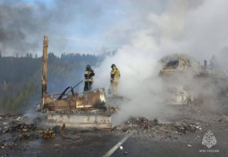 Горящие фуры потушили на трассе «Сибирь» в Нижнеудинском районе. Об этом сообщают пресс-служба ГАИ и ГУ МЧС России по Иркутской области. Всего в аварию у посёлка Камышет попали семь грузовых автомобилей и одна легковушка. Сгорели пять транспортных средств. Погиб водитель автовоза.