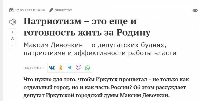 Крупное политическое событие случилось в Иркутской области на прошлой неделе. А именно, депутат Заксобрания региона от «Единой России» Максим Девочкин дал интервью. Ну очень обширное – прямо на телеге не объедешь. Заголовок отлит в граните: «Максим Девочкин: Грамотное и комплексное развитие Иркутска – это будущее и основа всего». И немедленно выпил.