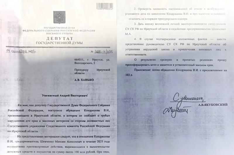И тут наш старый знакомый Александр Якубовский (теперь уже депутат Госдумы) вспомнил о бывшем товарище и взялся рьяно защищать Кондрашова. Согласно документам, попавшим в распоряжение нашей редакции, депутат активно пишет запросы в прокуратуру, утверждая, что кредиторы Кондрашова ни много, ни мало вымогатели.