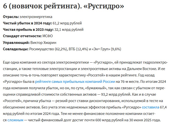 Инсайд. Почему «РусГидро» и «Россети» попали в десятку самых убыточных компаний России?