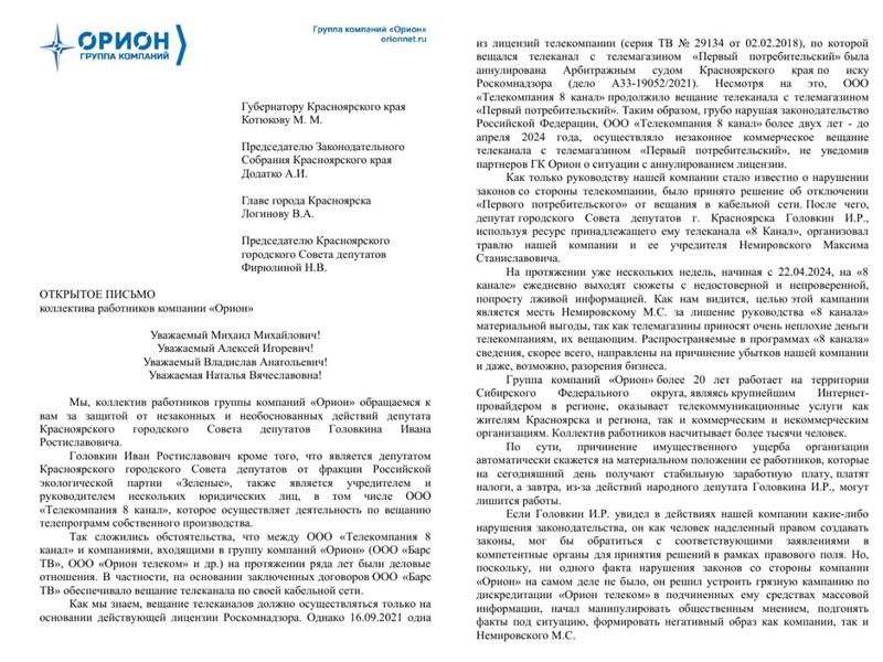 «Орион» не пустил ситуацию на самотёк и обратился за помощью к краевым властям, потому что сюжеты «8 канала» провайдер считает лживыми: