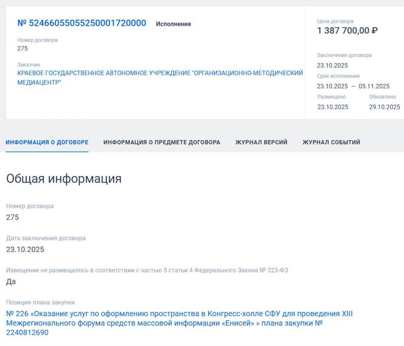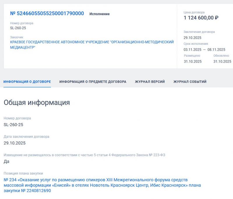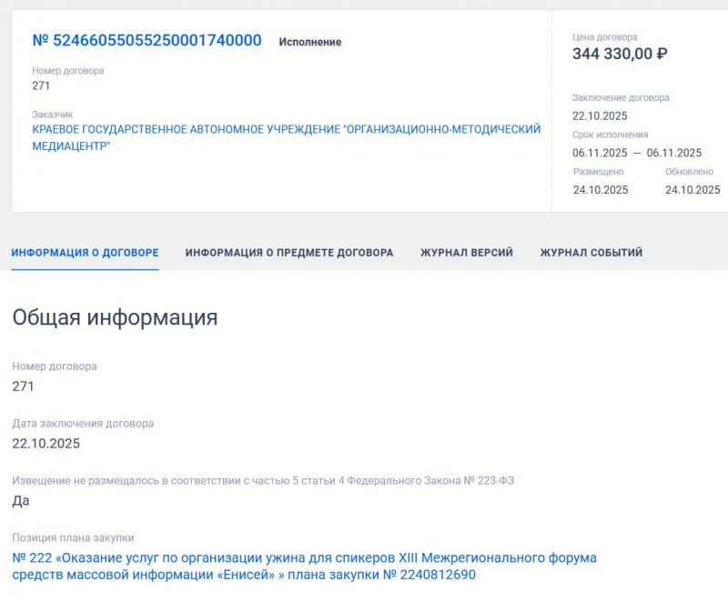 Мы нашли 16 госконтрактов по организации медиафорума в этом году, их общая сумма — 10 миллионов рублей с небольшим. Там всё: проживание федеральных спикеров в «Ибисе» и «Новотеле», обеды-ужины для них, оформление конгресс-холла СФУ, реклама события и множество других оргвопросов. А также проведение вечеринки под названием «Медианочь» для придворных журналистов.