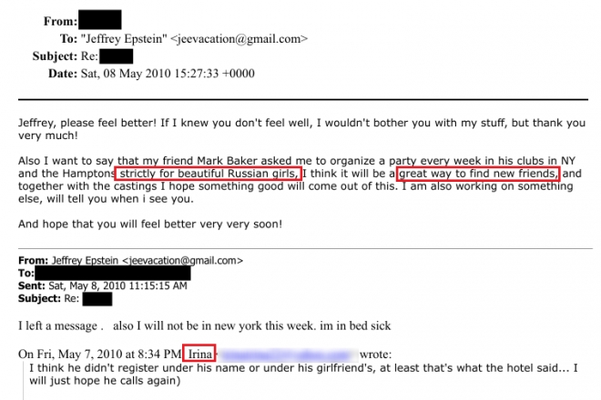 В одном из писем Ирина сообщила, что некий Марк Бэйкер попросил её в мае 2010 года каждую неделю организовывать в его клубах в Нью-Йорке вечеринки «строго для красивых русских девушек». По мнению Ирины, это прекрасный способ завести новых друзей.