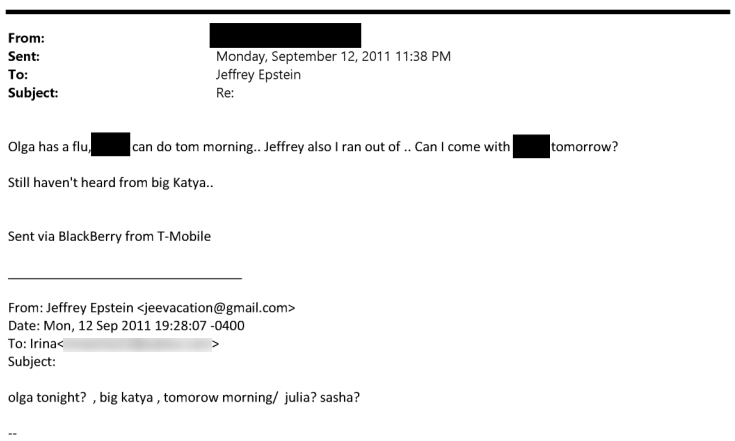Также в письмах можно найти уточнение, с «большой или маленькой Катей» хочет встретиться Эпштейн. А в одном из разговоров финансист настаивает на «новой Жене».