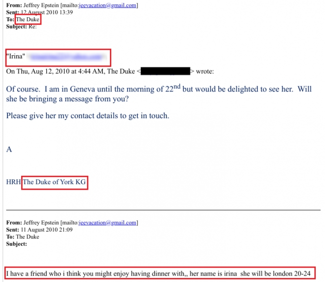 В письме от 8 августа 2010 года Ирина просит у Эпштейна совета о том, с кем было бы лучше встретиться в Лондоне. В то же время Эпштейн связывается с Эндрю и организовывает для него ужин с девушкой, которая будет в Лондоне в августе 2010 года. На вопрос экс-принца о том, есть ли какая-то другая полезная информация о девушке, Эпштейн отвечает: «Ей 26 лет, она русская, умная, красивая, заслуживает доверия, и да, у неё есть ваш адрес электронной почты». В отдельном письме Эпштейн уточняет электронную почту девушки и её имя: «Irina».