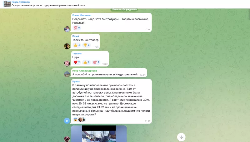 Но претензии населения глава округа оставил без внимания, продолжив публиковать победные реляции. Жители назвали такие отчеты фантастическими и неправдоподобными. Особенно людей возмутила информация об очистке тротуара по улице Шоссейная.