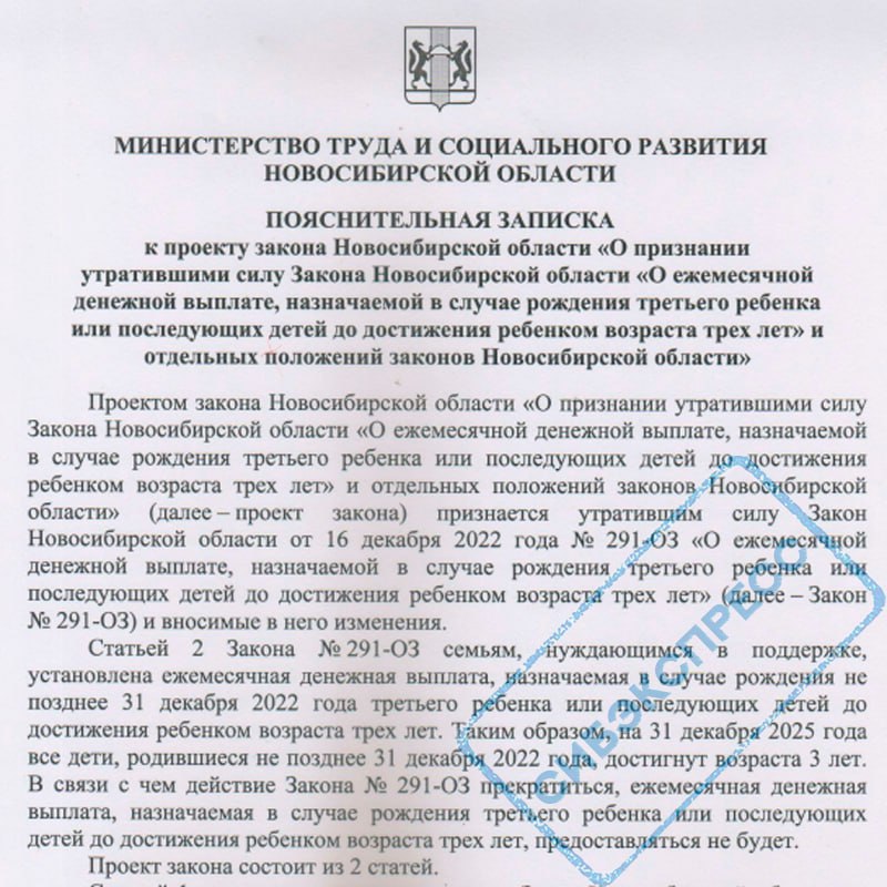 Речь идёт о ежемесячной денежной выплате в размере 12,4 тысячи рублей. Сейчас эти деньги получают родители за каждого ребёнка до достижения им трёхлетнего возраста. Однако Министерство труда и социального развития региона нашло формальный повод избавиться от этой финансовой нагрузки. Чиновники пояснили, что в действующей версии областного закона деньги положены только тем детям, которые родились не позднее 31 декабря 2022 года. По их мнению, к концу 2025 года всем этим детям уже исполнится три года, а значит, действие самого закона № 291-ОЗ можно признать утратившим силу и прекратить выплаты.