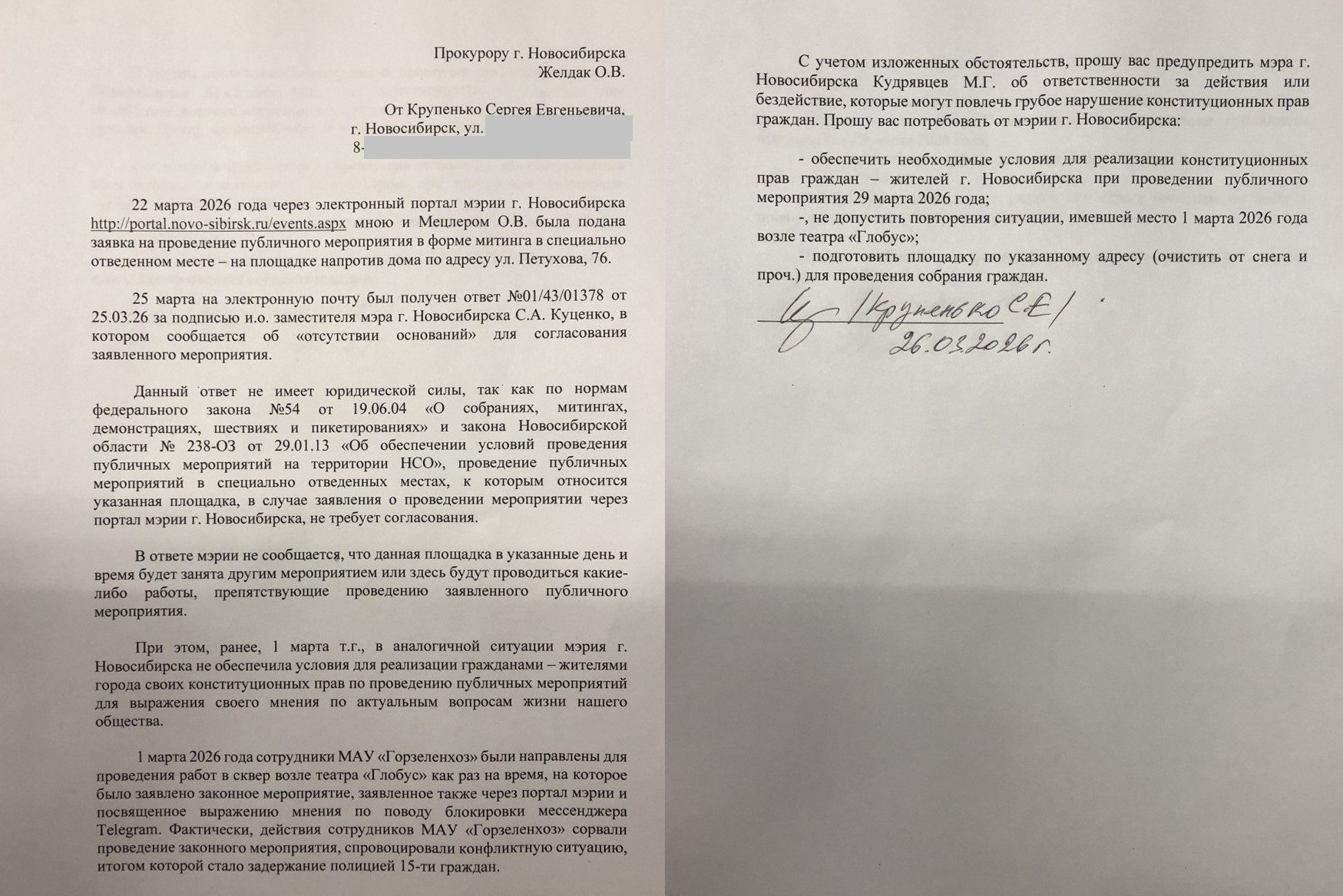 Попытка общественности спросить у власти, что это вообще было, наткнулась на глухую стену из полиции и коммунальной техники. Активисты Российской коммунистической партии интернационалистов (РКП(и)) заявили митинг на 29 марта в гайд-парке на улице Петухова. По закону такие площадки созданы именно для того, чтобы люди могли высказаться без долгих согласований с чиновниками. Достаточно простого уведомления, но мэрия Новосибирска во главе с Максимом Кудрявцевым, видимо, решила, что закон ей не указ.