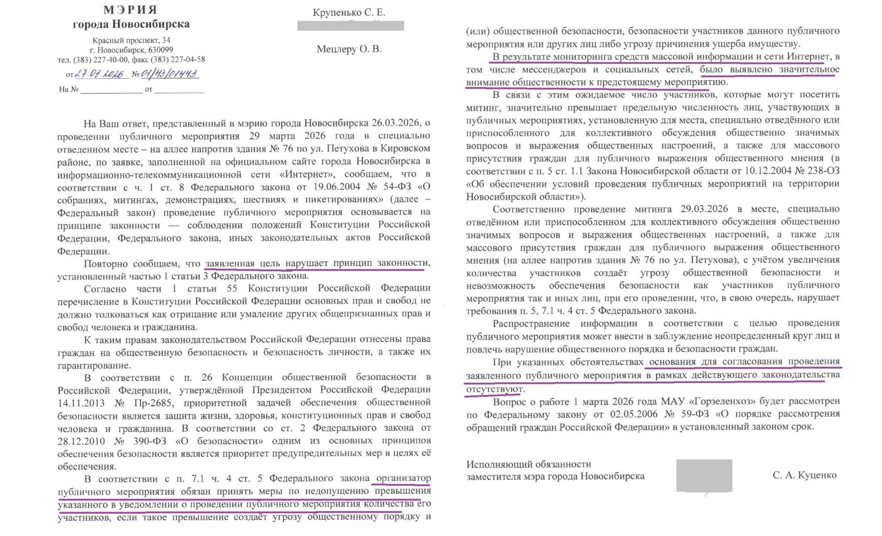 Ответ из администрации пришёл за подписью Сергея Куценко. Это бывший силовик, ныне возглавляющий департамент по ЧС, который подменял на посту вице-мэра Максима Останина. Куценко в своём письме выдал интересную формулировку: митинг запрещён, так как он нарушит «интересы неопределённого круга лиц в связи с распространением ложной информации». Кроме того, чиновники в ответе заявили, что мониторинг социальных сетей сулит «значительное превышение предельной численности» участников. При этом в официальном реестре мест для митингов (постановление №31-п) указано: площадка на Петухова, 76 вмещает 1608 человек. Организаторы рассудили так: ответ мэрии юридически ничтожен, а для гайд-парков никакого «разрешения» не требуется в принципе. Поэтому митинг решили проводить, несмотря на бюрократические уловки.