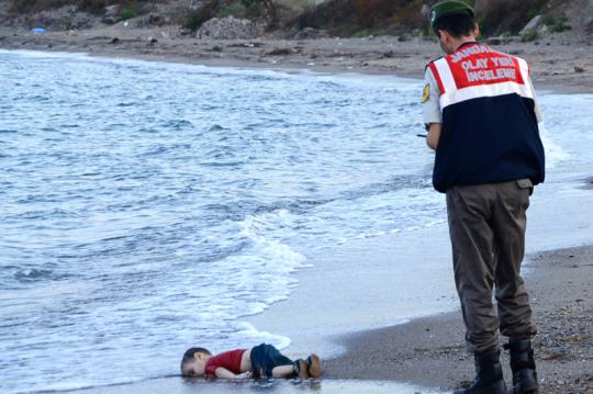 Фотография ниже накануне, 3 сентября, облетела весь мир. Тело трехлетнего мальчика-беженца из Сирии прибило к берегу на пляже турецкого города Бодрум. Семья мальчика пыталась эмигрировать в Канаду, однако судно потерпело крушение. Всего в результате кораблекрушения погибли 12 человек, среди них восемь детей. Полиция Турции уже задержала четверых сирийцев, которых подозревают в причастности к организации перевозки мигрантов из Сирии.