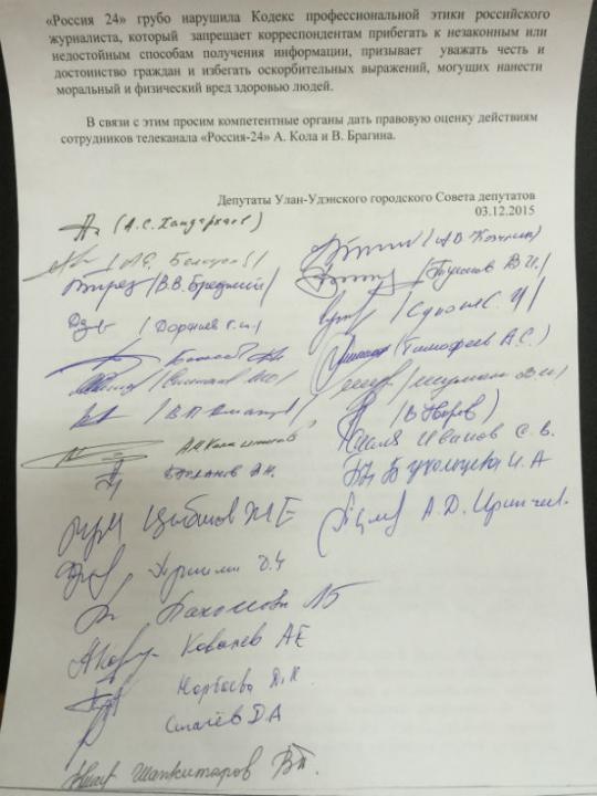 Городской совет депутатов Улан-Удэ направил обращения прокурору Бурятии и главе МВД с просьбой дать правовую оценку действиям журналиста «Россия-24» Артёма Кола и оператора Владимира Брагина, которые 2 декабря стали участниками потасовки в кабинете мэра Улан-Удэ.
