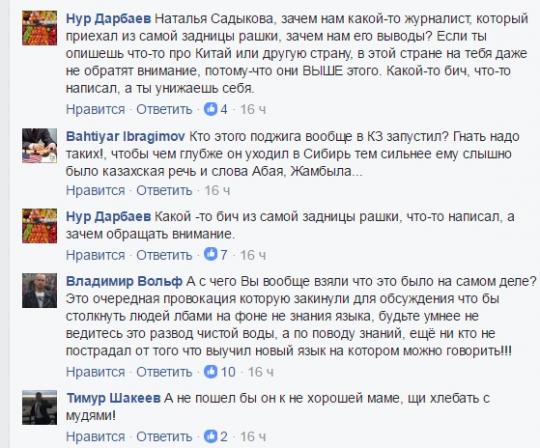 Спустя несколько часов после публикации известный казахский журналист Наталья Садыкова (проживает в Киеве) разместила на своей странице в Фейсбуке отдельные выдержки из статьи для обсуждения с друзьями и подписчиками: