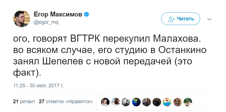 Напомним, что согласно недавно опубликованным рейтингам последнего телевизионного сезона 2016/2017, «Россия 1» впервые за многие годы смогла обойти «Первый канал», заняв 1 место. Если информация о переходе Малахова подтвердится, то можно будет с уверенностью говорить о масштабном кризисе в епархии Константина Эрнста. На одних Малышевой, Гузеевой и Шепелеве далеко не уедешь.