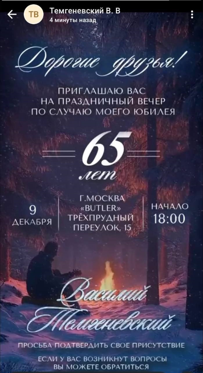 Примерно так должна начинаться история про грядущий 65-летний юбилей главы Байкальска Василия Темгеневского. Про это большое событие в жизни Василия Вячеславовича 10 ноября узнал весь иркутский Телеграм. А именно, там появилось такое вот приглашение на «праздничный вечер» в дорогом московском ресторане «Butler» на Патриарших прудах.