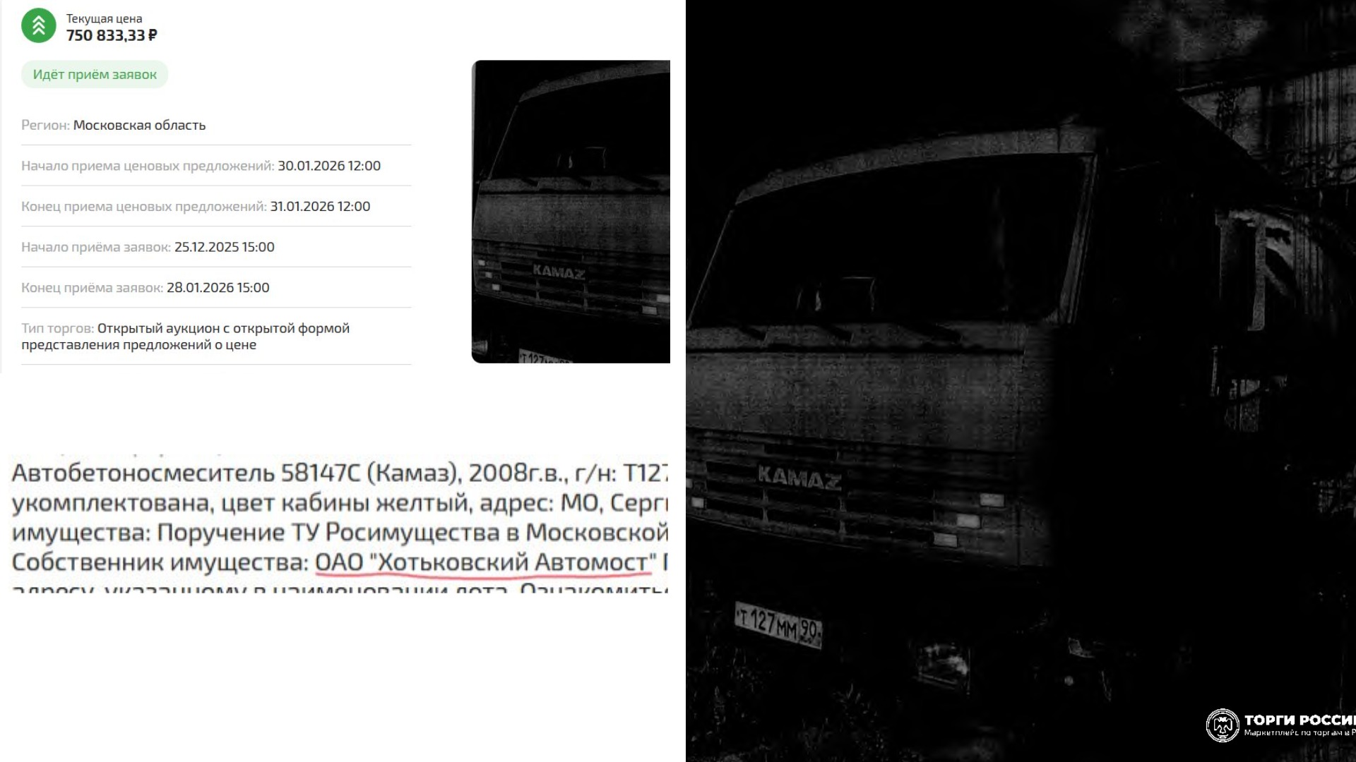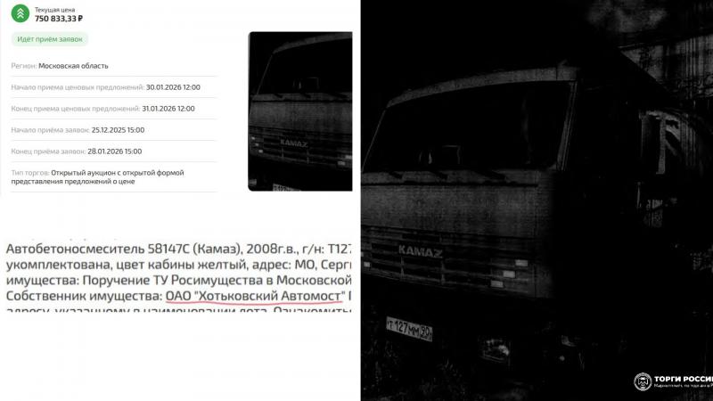 Кроме того, на государственной площадке torgi.gov.ru стартовала распродажа имущества «Хотьковского автомоста». Бабр нашёл лот под названием «Автобетоносмеситель модели 58147С на шасси КАМАЗ». Год выпуска техники: 2008. Начальная цена: 750 тысяч рублей. Продавец: ТУ Росимущества (по поручению приставов).