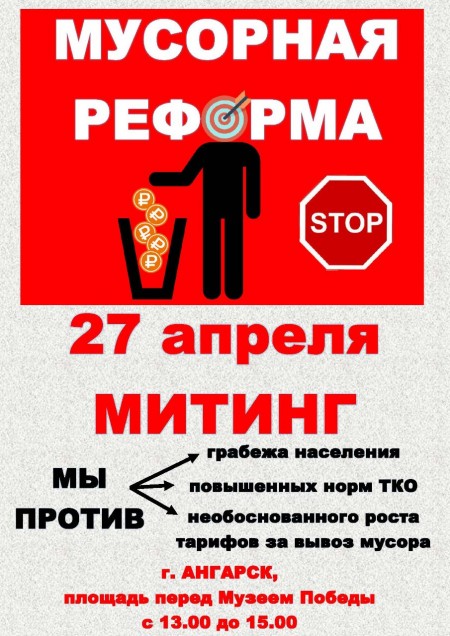 В субботу, 27 апреля 2019 года, в трёх городах Иркутской области Иркутске, Ангарске и Усолье-Сибирском одновременно пройдут митинги против «мусорной реформы». Организаторами митинга выступает сообщество предпринимателей, но, по всей видимости, к ним присоединится большое число простых горожан.