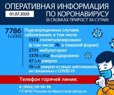 Число подтверждённых случаев заражения коронавирусом в Прибайкалье к утру 1 июля увеличилось на 233 человека. Число погибших возросло до 105. Всего с начала пандемии в регионе зарегистрировано 7786 заболевших. 1572 человека госпитализированы, 2731 человек проходит лечение амбулаторно.