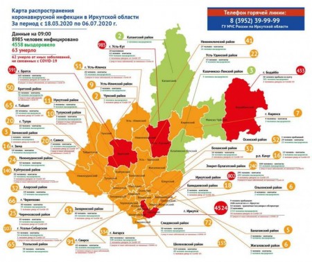 По данным на 2 июля, в Иркутской области зафиксировали 8025 случаев заражения коронавирусом. Суточный прирост - 239 человек. 3603 пациента уже выздоровели, 225 - за последние сутки. 1572 человека находятся в больницах, 80 - переносят болезнь в тяжёлой форме.