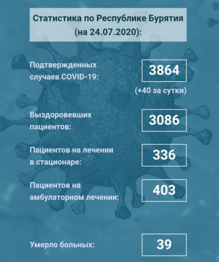 По состоянию на 8 утра 31 июля в Бурятии зафиксировано 4123 случая заражения коронавирусом. 2315 из них — в Улан-Удэ. За последние сутки количество заражённых выросло на 42 человека. 367 человек находятся в стационарах республики, 331 человек лечится амбулаторно.