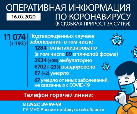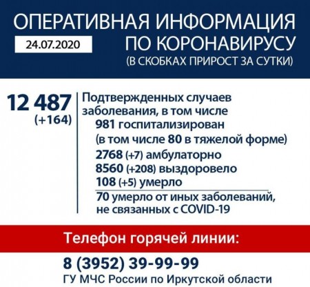 По состоянию на утро 31 июля в Иркутской области зарегистрировано 13568 лабораторно подтверждённых случаев коронавирусной инфекции. Из 801 человека, которые сейчас проходят лечение в стационарах, у 56 болезнь протекает в тяжелой форме. Амбулаторно лечатся 2806 человек.