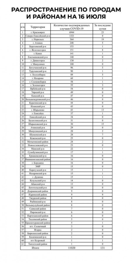 Число скончавшихся с начала пандемии в регионе возросло до 331 человека. За сутки коронавирус подтвердился ещё у 145 жителей Красноярского края. По данным Роспотребнадзора на 31 июля, общее число заболевших коронавирусом в крае достигло 13145 человек.