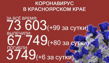 С 1 мая по 1 июня в Красноярском крае нашли 3148 больных коронавирусом. На 1 июня в регионе насчитывается 73 603 случая заражения коронавирусом. Суточный прирост – 99, темп прироста – 0,1%. За всё время выздоровело 67 749 человек, в том числе 80 за последние сутки.